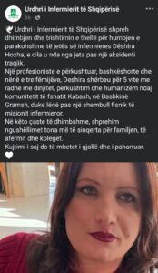 Urdhri i Infermierit të Shqipërisë ka reaguar me dhimbje dhe trishtim të thellë pas humbjes tragjike të jetës së koleges së tyre, infermieres Dëshira Hoxha, e cila u nda nga jeta si pasojë e një aksidenti automobilistik të ndodhur dje në një zonë malore të Gramshit (26 janar).